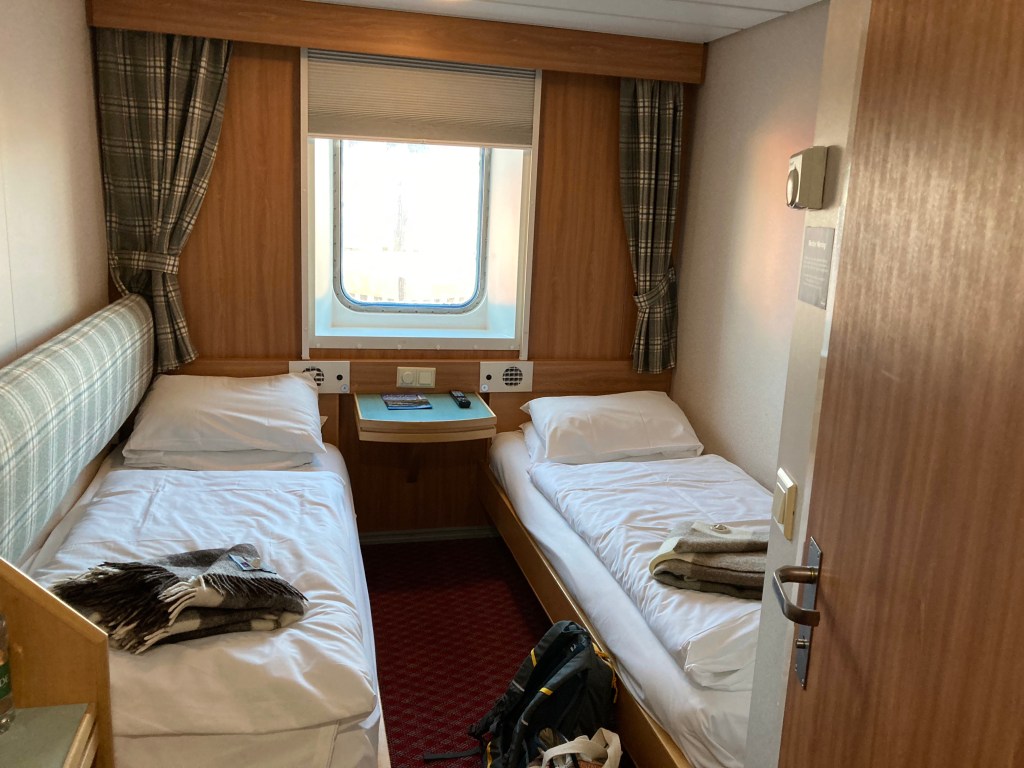 This was the first time I had booked a cabin on the Northlink boat and oh my goodness, what a joy. Normally I have either had a pod or more often slept in the bar on the sofas, along with the other snoring people. This is partly because it’s quiet expensive having a cabin on your own but mainly because I am so excited I don’t sleep much and go out on deck a lot.