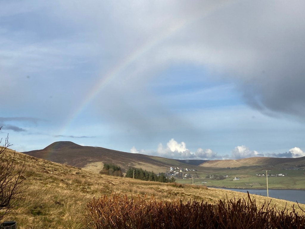I still can’t believe a week later that this is where I live. The weather as you would expect has gone through the range of sunshine, rainbows, shows, hails, gale force winds gusting 10, torrential rain and calm and still. It’s still chilly but when it’s bright and clear there is warmth in the sunshine.