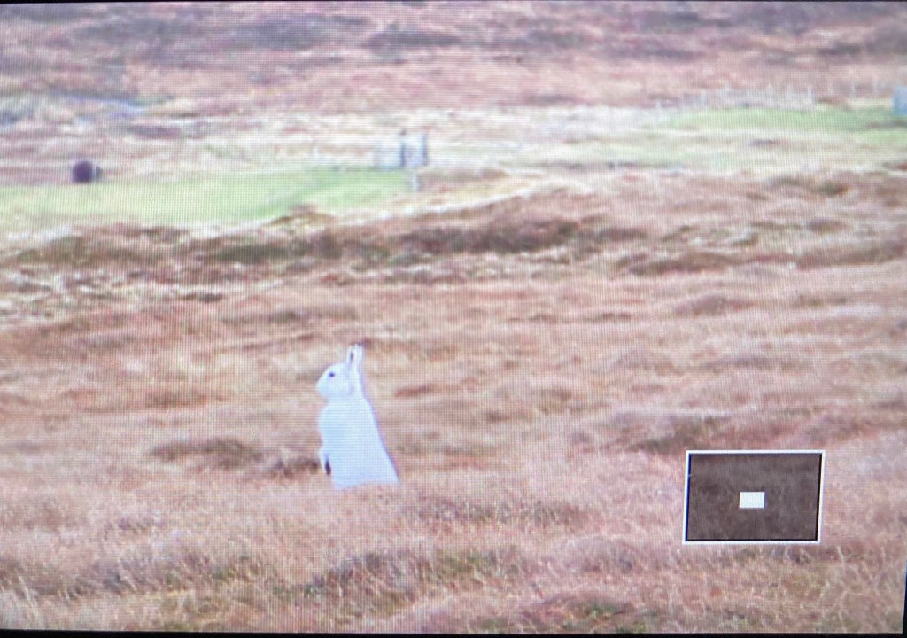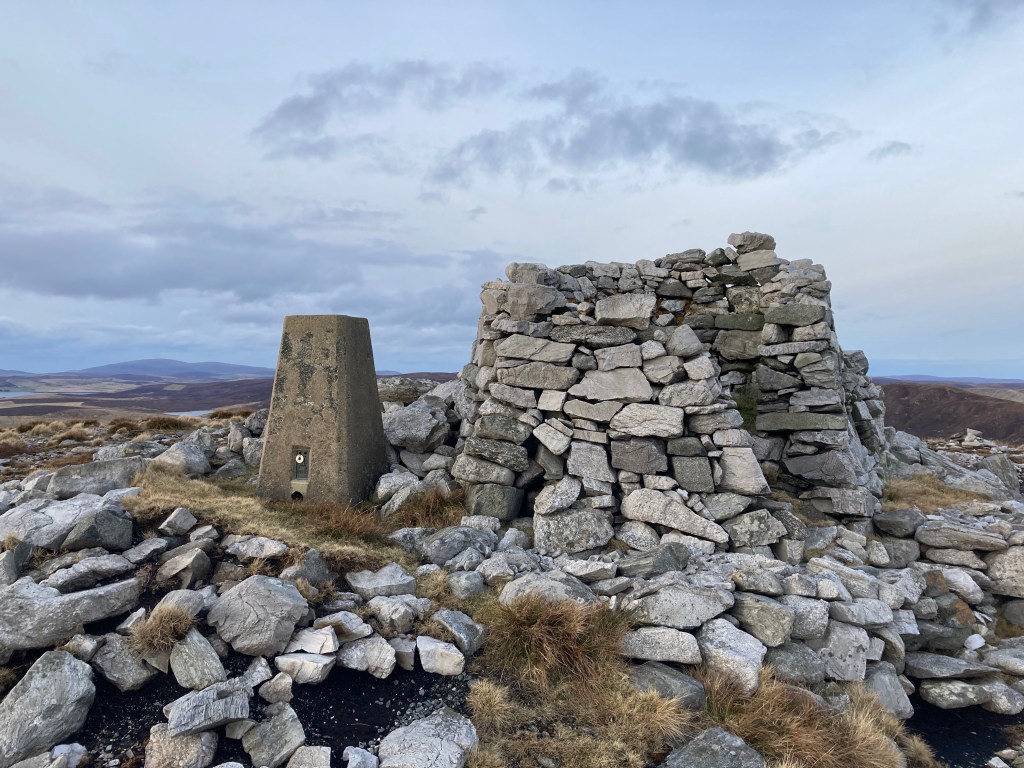 I have walked up the hill behind the house, ‘Sneugie’ where to my delight saw and managed to photograph one of four arctic hares in their winter coats. It was a blustery but sunny day and the view right down the Voe was beautiful but then as I reached the trig point at the top the 360 degree panorama over Shetland was stunning in the late afternoon light.