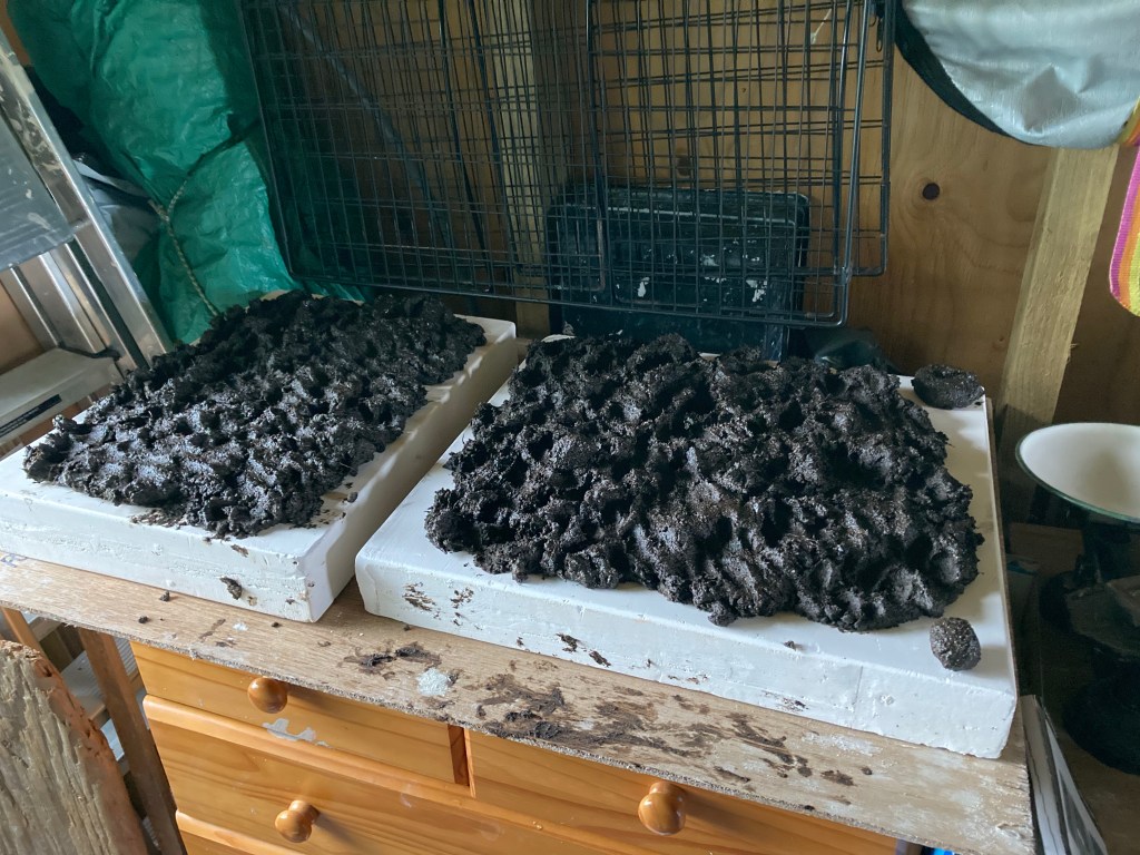 The kiln still awaits connection, things are hopefully moving forward as without it I am stifled in the firing process at the moment. I have had the electrician to visit, the kiln can be connected, good news, a separate cable needs to be run from the house to the shed, my landlord has not objected but wants to speak to the electrician about it so I wait, with everything crossed. Whilst I wait I have been collecting, processing and making new pots and materials. Enjoying the space to make both in the shed and outside, processing materials is a joy as it’s no longer in a tiny, kitchen space.