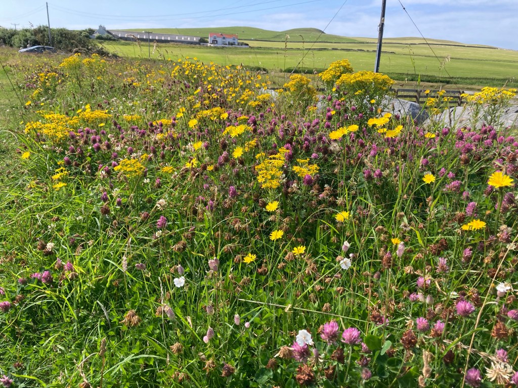 Wildlife- The seasonality is noticeable here in the wildlife and plant life. At the moment the hills are turning purple as heathers and scabious begin to take over from the yellows of ragwort,white umbellifers and cotton grass whilst earlier on the orchids and spring squill were abundant. The birds, sparrows and starlings everywhere are eating me out of bird food, whilst Curlews have raised chicks in the field behind the house, Oystercatchers have run the gauntlet with theirs by the side of busy roads and Tirricks ( Terns) screech and dive to catch fish. The Guillemots are sending their chicks known as jumplings off the cliffs into the sea and the pufflings will soon be off at night to spend the next few years at sea.