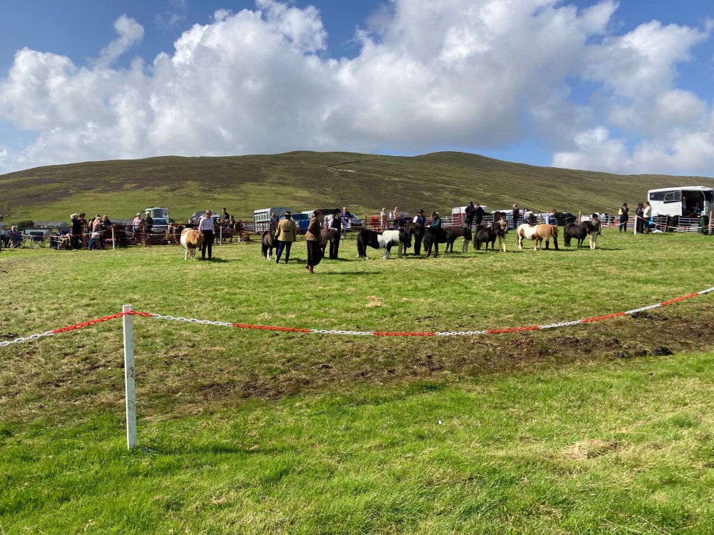 The weather provided a hot and sunny day for the 40th Annual Voe Show. The car park is packed and the roads are strewn with cars parked wherever there is a space. It feels like the whole island has descended on the show field but this is impossible as the Scalloway regatta is also in full session so the rest of the island will be championing sailing and yoal races for the pride of the district.